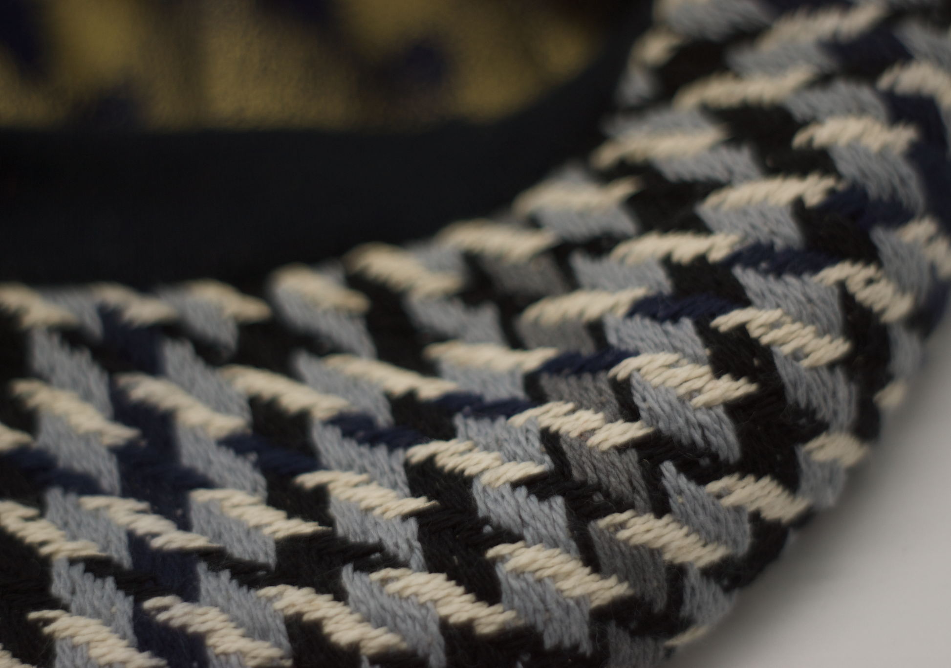Bord-côte en coton et elastanne bleu, détails en fil de coton, laine, simili-cuir et doublure en coton.